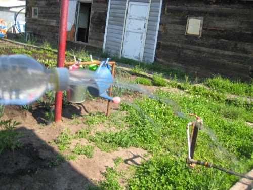 Я думала что будем делать какой-нибудь эксперимент,холод был жуткий.Но Лето о нас вспомнило и стало жарко и солнечно!!Я взяла пластмас.бутылку в крышке сделала дырочки и вуаля- самодельная брызгалка готова!!!!